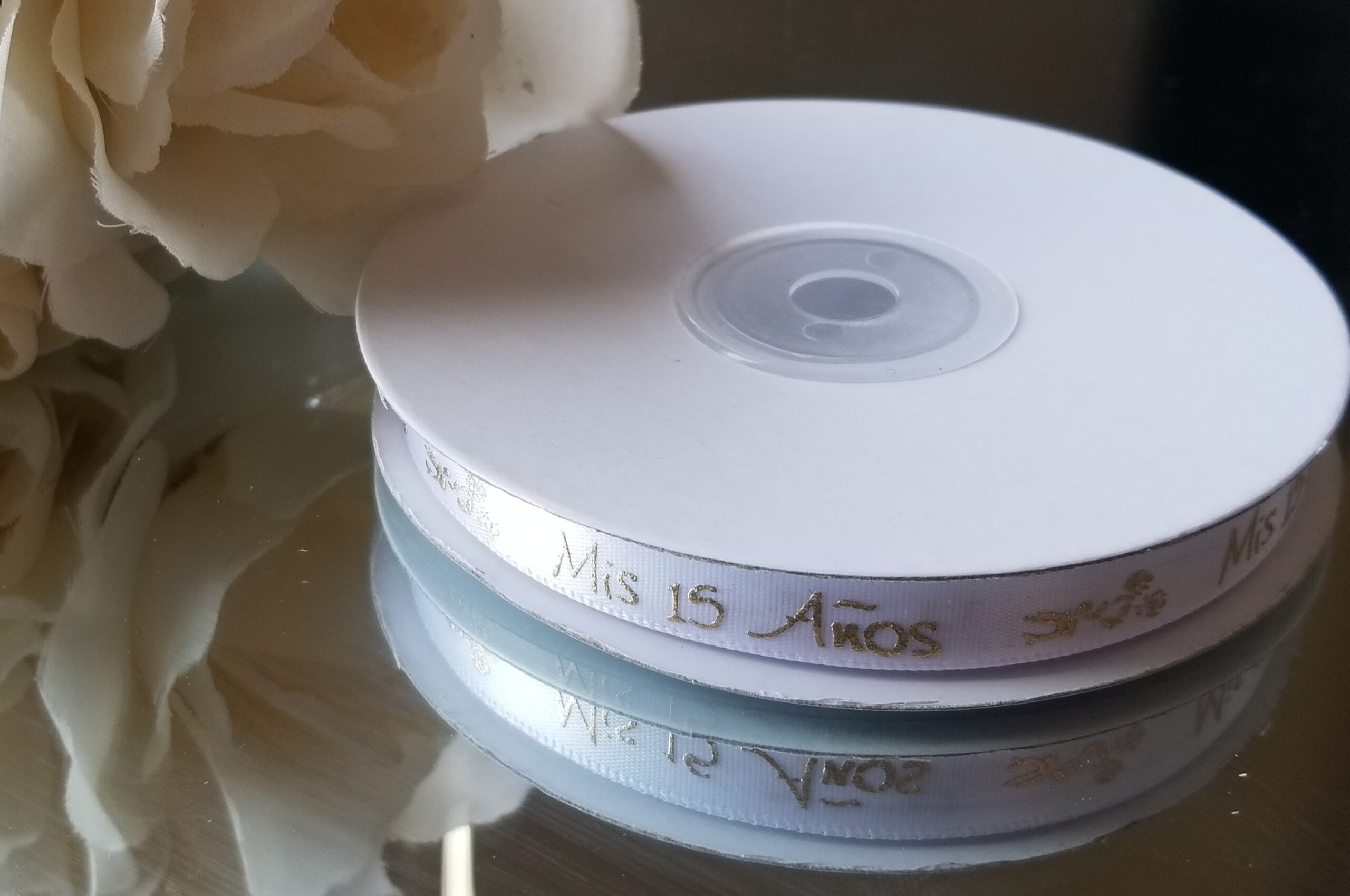 3/8″25Yds White Gold Metallic Favor/”Mis 15 Años”/Sweet15 Satin Ribbon