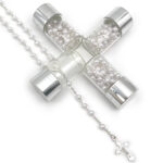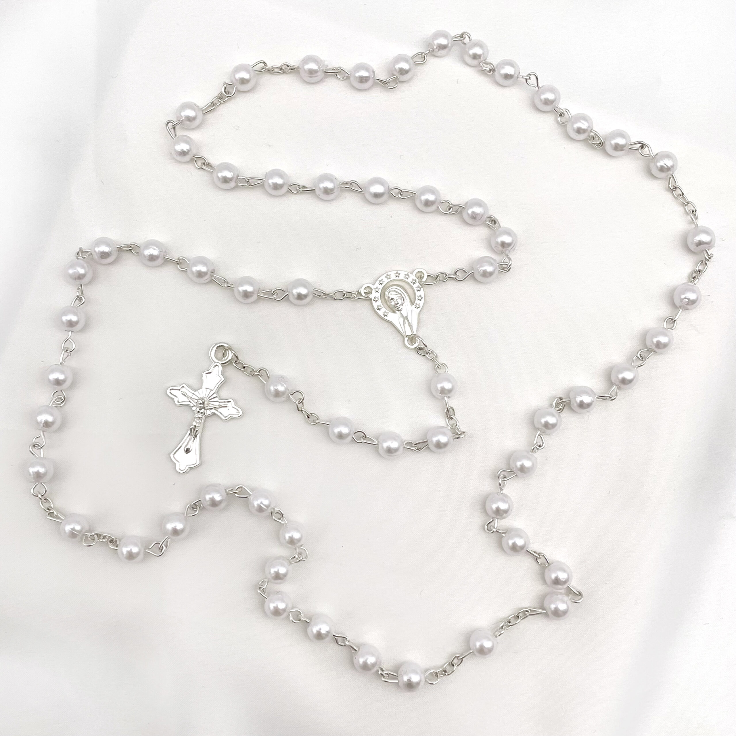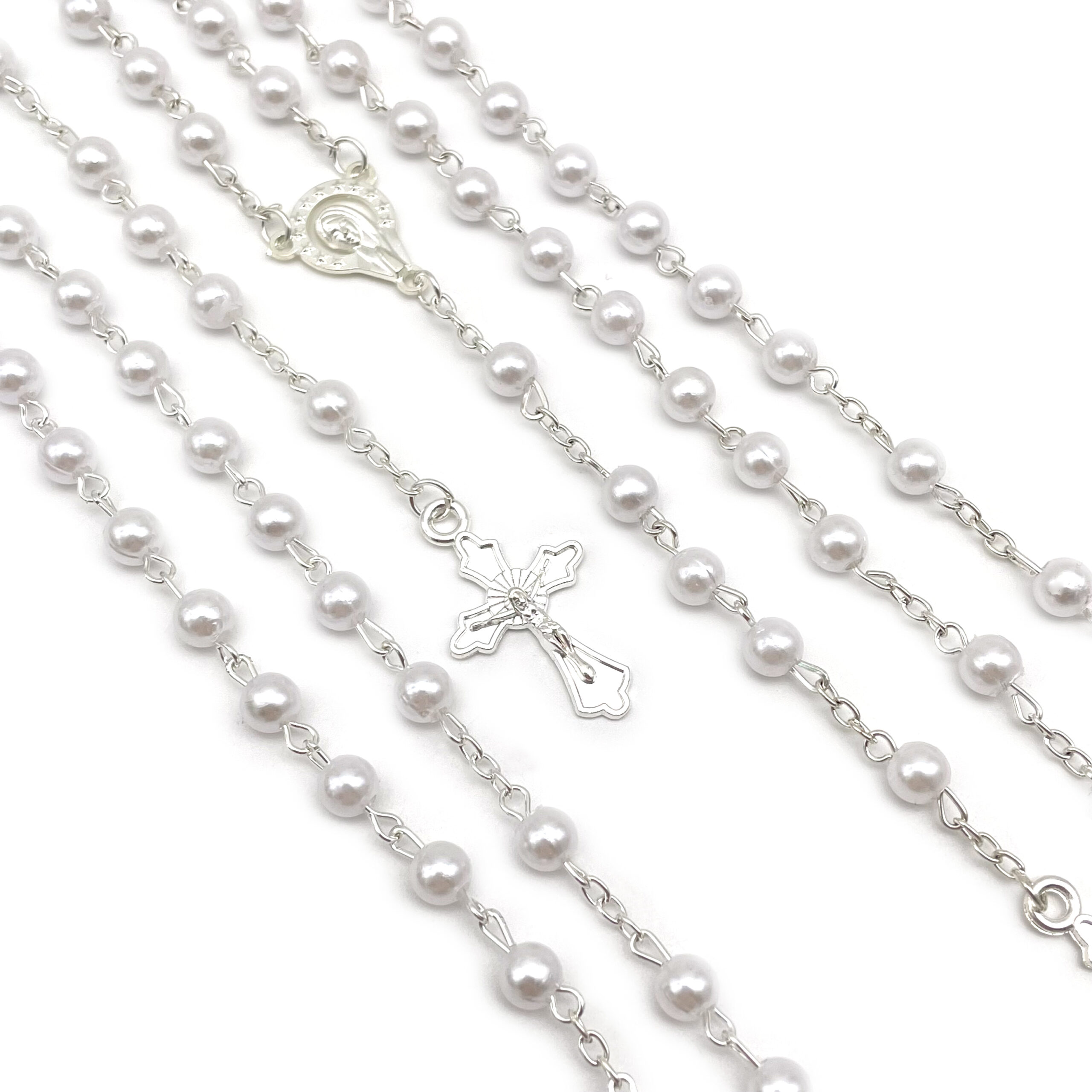 Design: Traditional Cross with Image of our Lady of guadalupe centerpiece.High quality rosaries are made of Pearl beads and silver plated chain.