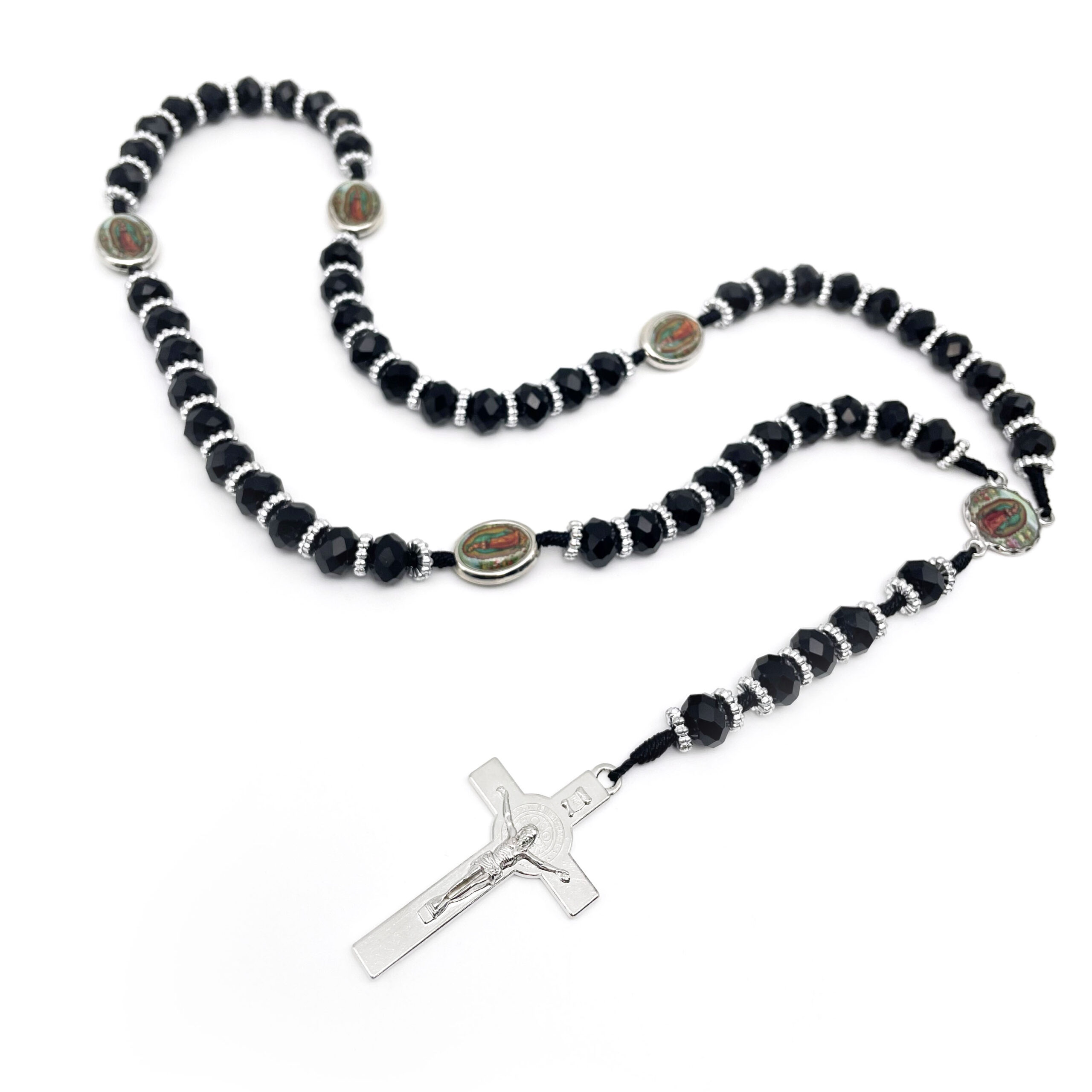 Crystal Beads Snowflake Spacer Catholic Rosary Crucifix Necklace San Judas & Our Lady of Guadalupe Recuerdos de Bautizo Communion Religious Gifts (Black)