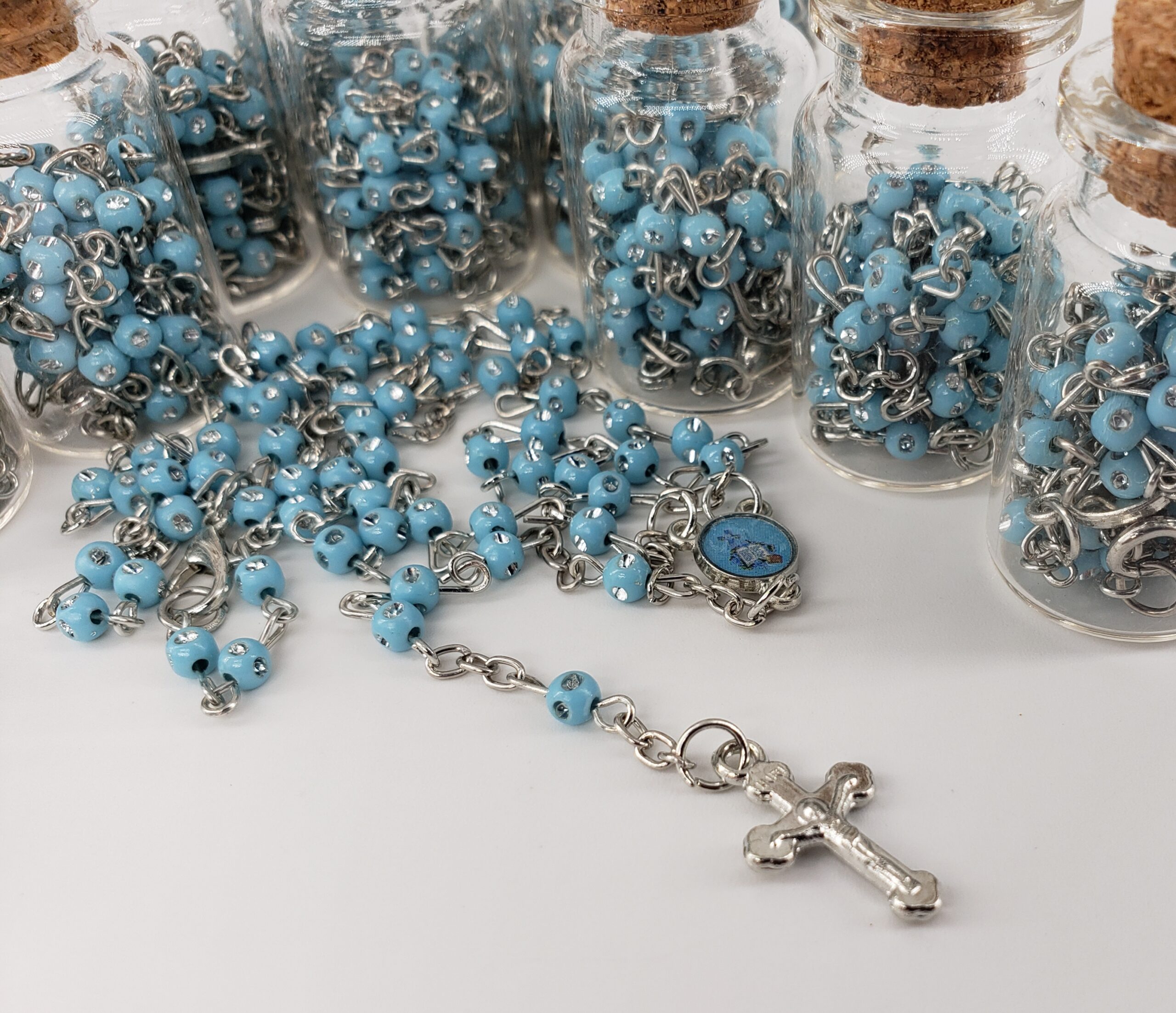 These rosarys are perfect for Mi Bautizo/ Nuestra Boda/Mis 15 Anos party favorites. Each one comes in a glass bottle shaped container with shining diamonds and cross. Rosary size: 6mm beads 16 1/2″ Bottle size :1.75″×7/8 “