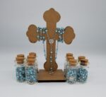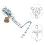 These rosarys are perfect for Mi Bautizo/ Nuestra Boda/Mis 15 Anos party favorites. Each one comes in a glass bottle shaped container with shining diamonds and cross. Rosary size: 6mm beads 16 1/2″ Bottle size :1.75″×7/8 “