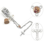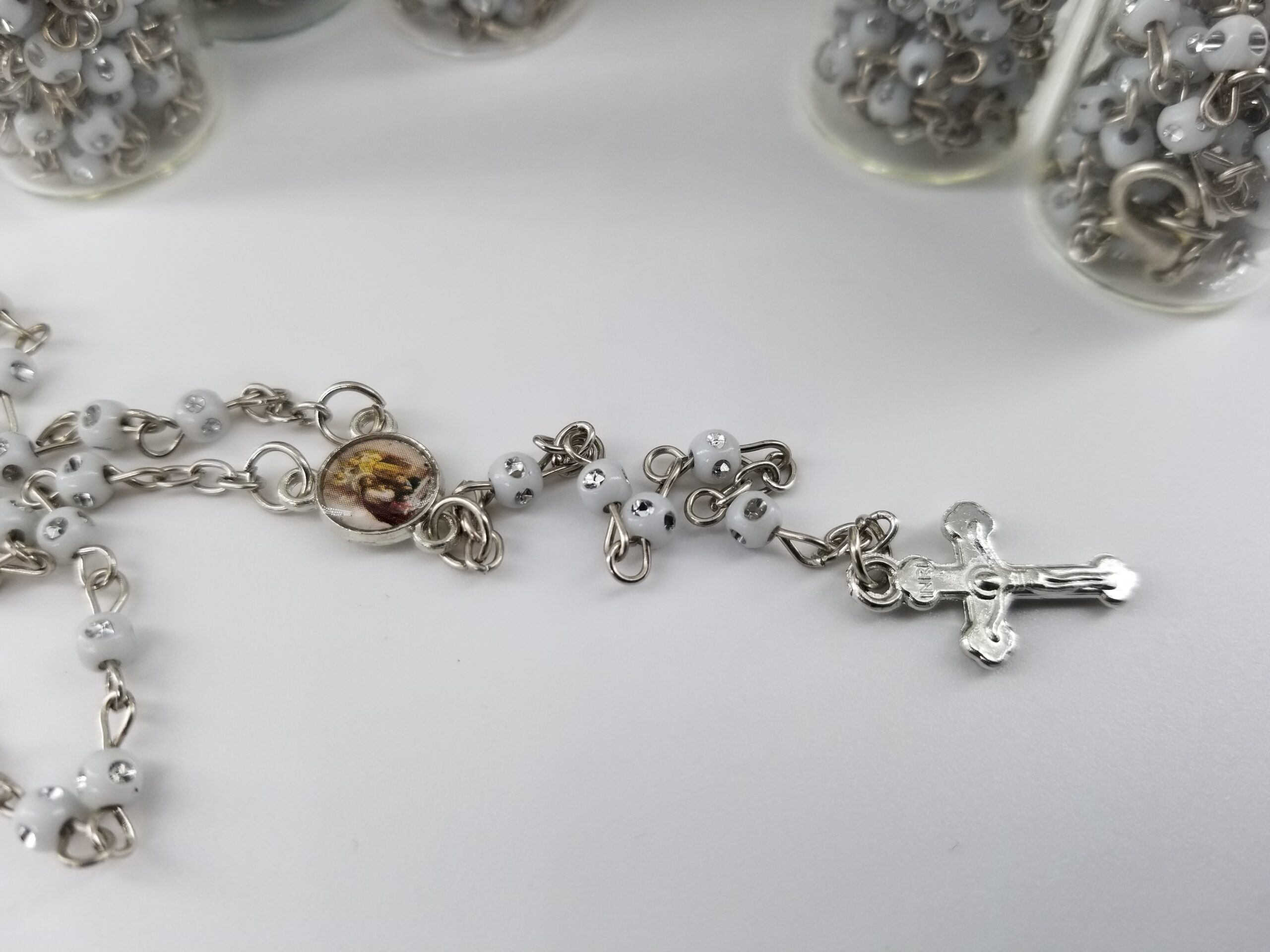 These rosarys are perfect for Mi Bautizo/ Nuestra Boda/Mis 15 Anos party favorites. Each one comes in a glass bottle shaped container with shining diamonds and cross. Rosary size: 6mm beads 16 1/2″ Bottle size :1.75″×7/8 “