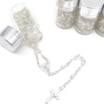Baptism Our Lady of Guadalupe Clear Pearl Beads Rosaries In Glass Jar Bottle Recuerdos de Bautizo First Communion Sweet 15 Birthday Party Favor For Boy Girl (White Silver)