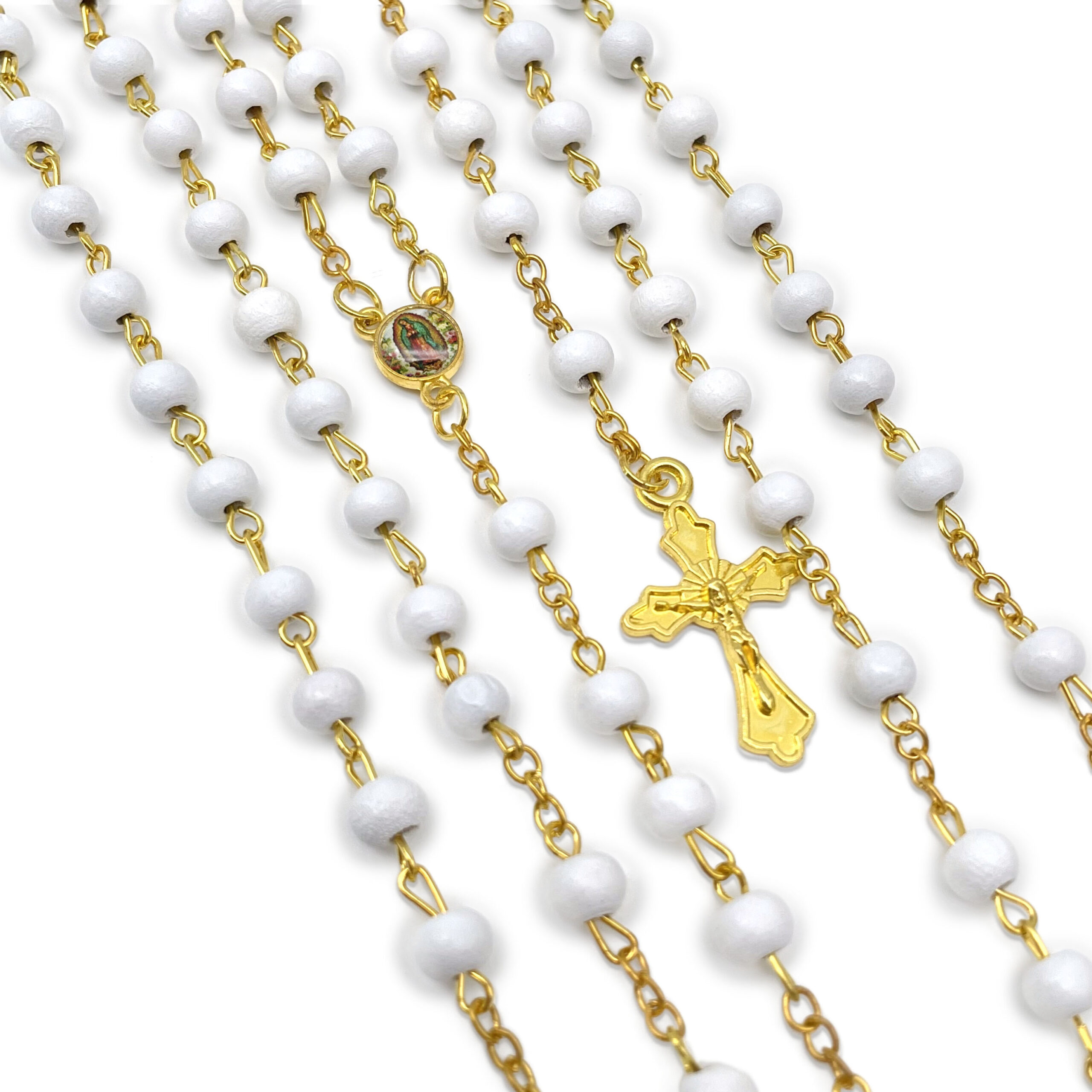 Traditional Cross with Image of our Baby Angel & Lady of guadalupe & St. Jude Judas centerpiece.High quality rosaries are made of white wood beads and silver plated chain.