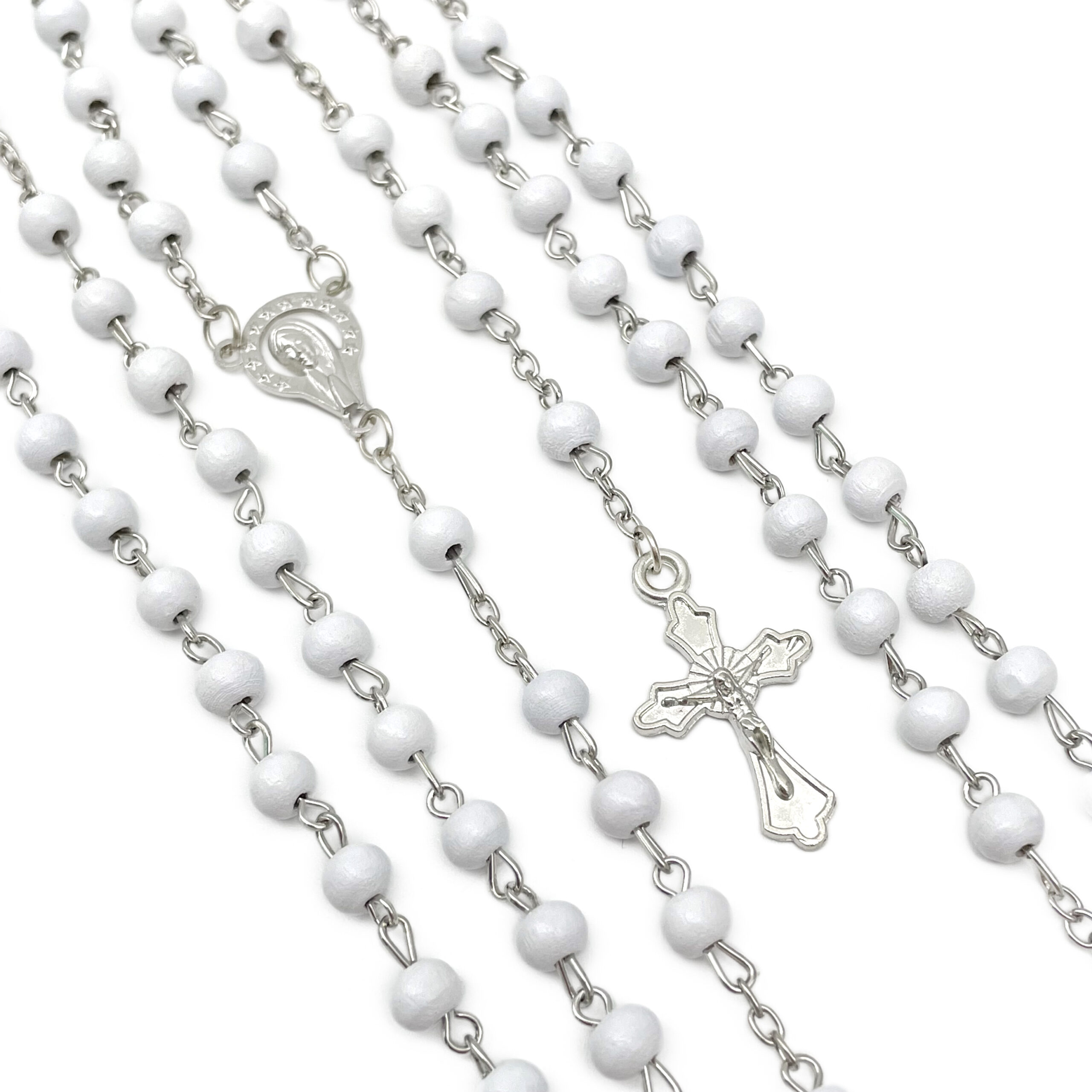 Traditional Cross with Image of our Lady of guadalupe centerpiece.High quality rosaries are made of White wood beads and silver plated chain.