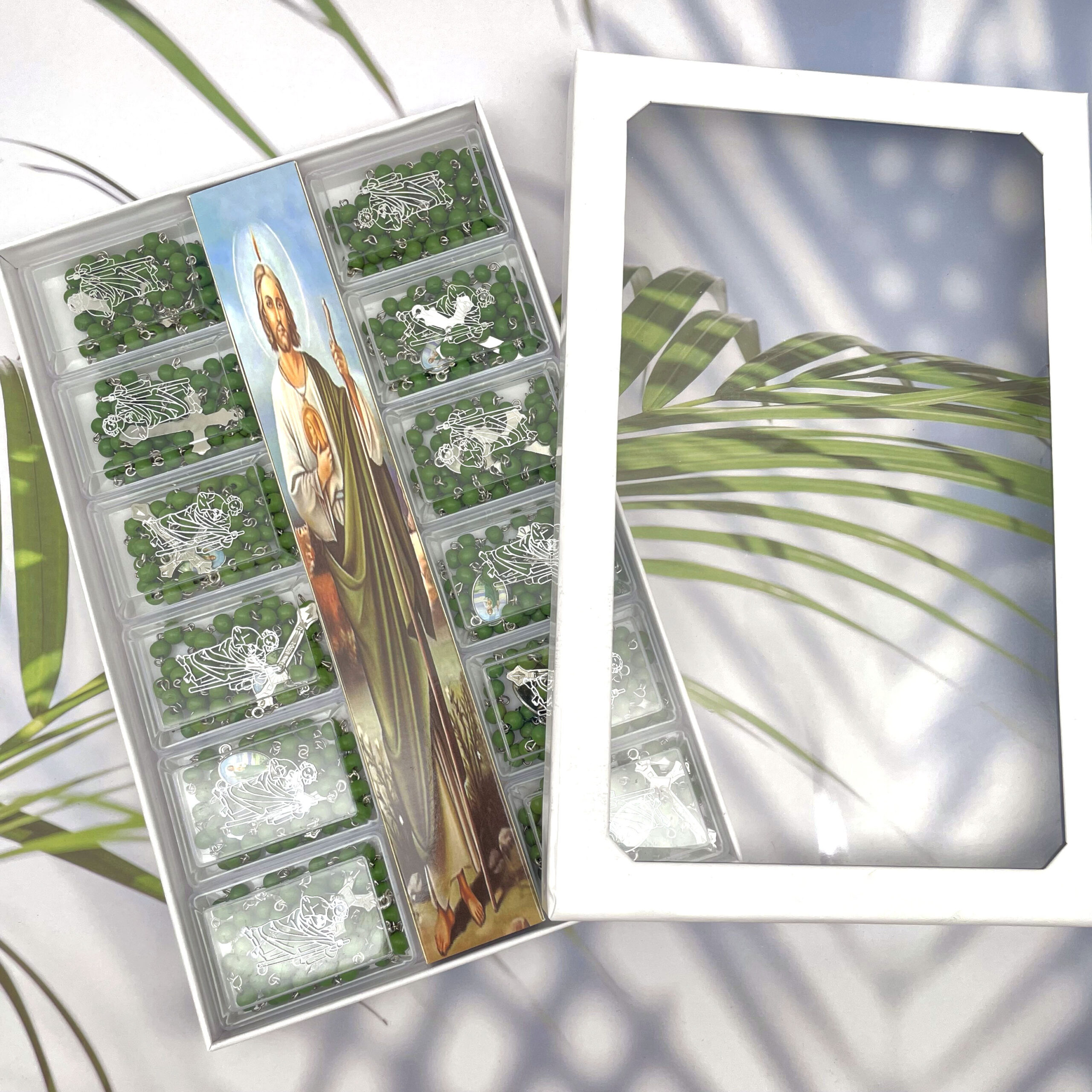 • About Packing: The package includes 12 pieces of scented rosary beads in individual boxes of our Lady of Guadalupe silver print design. El collar de San Judas representa un símbolo de fe, fuerza y buena fortuna porque protege a los indefensos. Se le considera un intercesor directo de Jesucristo como santo al que apelar en situaciones difíciles y desesperadas y se le atribuyen muchos milagros. • Sobre el embalaje: El paquete incluye 12 piezas de cuentas perfumadas del rosario en cajas individuales con el diseño de impresión en plata de Nuestra Señora de Guadalupe. |