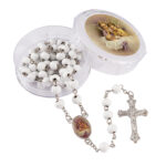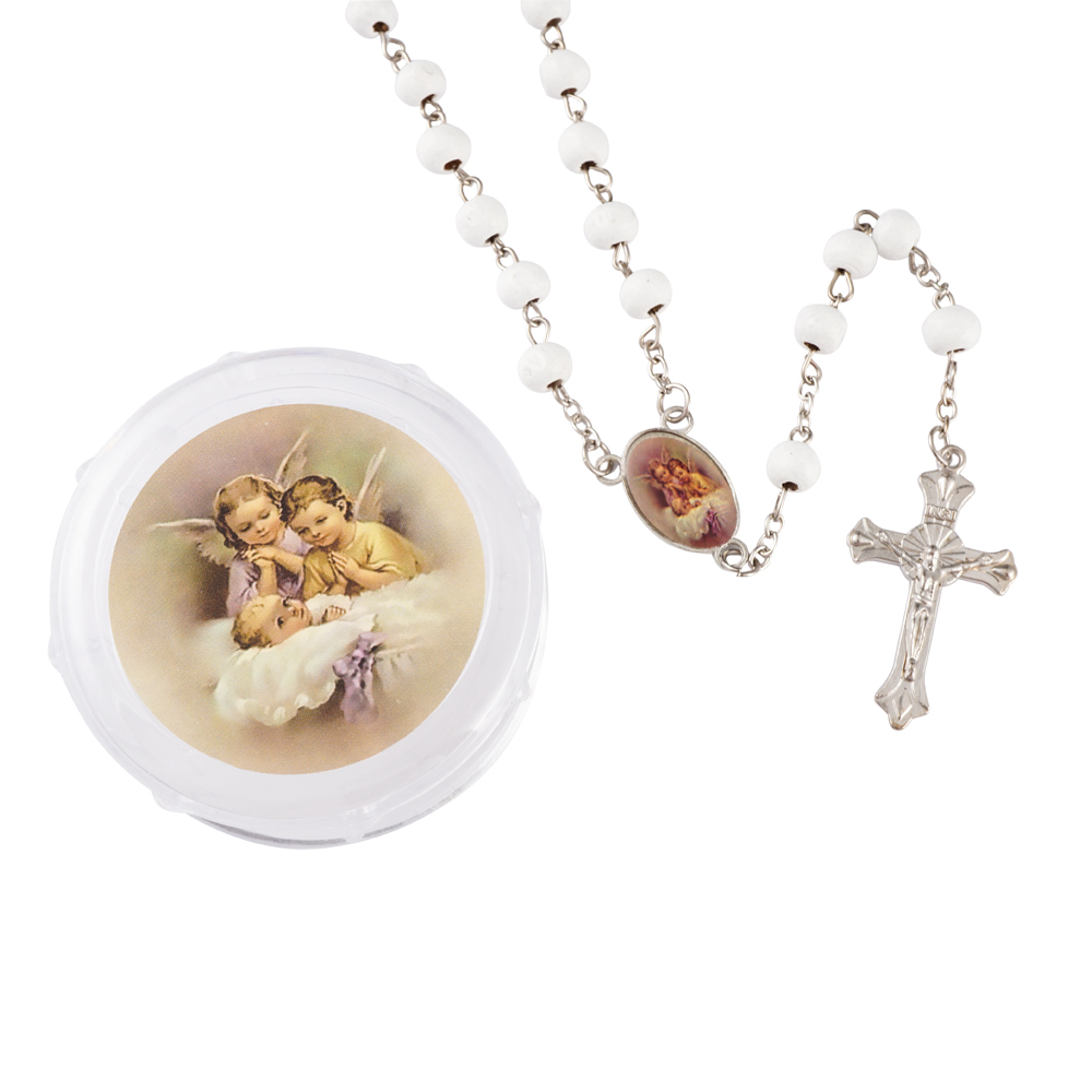 Traditional Cross with Image of Baby Guardian Angel centerpiece.High quality rosaries are made of white wood beads and silver plated chain