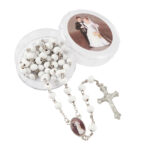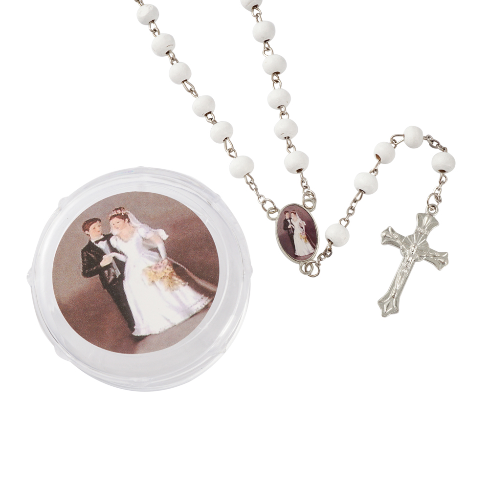 Traditional Cross with Image of Wedding Shower Nuestra Boda centerpiece.High quality rosaries are made of white wood beads and silver plated chain